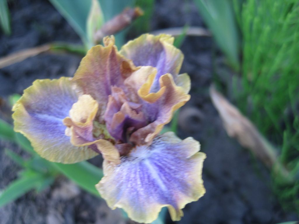 Высота 23 см,V,Ст. - светло-оливковые, ф.-сиреневые,на оливковом поле светло-сиреневые полосы, переходящие в кайму, б.- белая на конце, жёлтая в