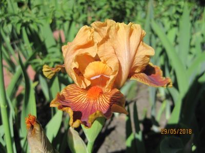 Высота 45 см., VЕ, с.- оранжево-розовый, ф.- оранжево-розовый, ореховая растушевка по оранжево- розовому полю, тонкая жёлтая кайма, б.- мандариновая, ТАНЖЕР ТИНГИС x FRISKY FROLIC.